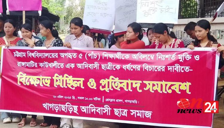 খাগড়াছড়িতে অপহৃত চট্টগ্রাম বিশ্ববিদ্যালয়ের (চবি) ৫ শিক্ষার্থীর মুক্তির দাবি ও রাঙামাটিতে তরুণী ধর্ষণের সাথে জড়িতদের গ্রেফতারের দাবিতে খাগড়াছড়িতে বিক্ষোভ মিছিল ও সমাবেশ অনুষ্ঠিত হয়েছে। সমাবেশ অবিলম্বে অপহৃত ৫ শিক্ষার্থীকে সুস্থ অবস্থায় দ্রুত মুক্তির দাবি জানানো হয়। অন্যথায় কঠোর কর্মসূচির হুঁশিয়ারি দেওয়া হয়।