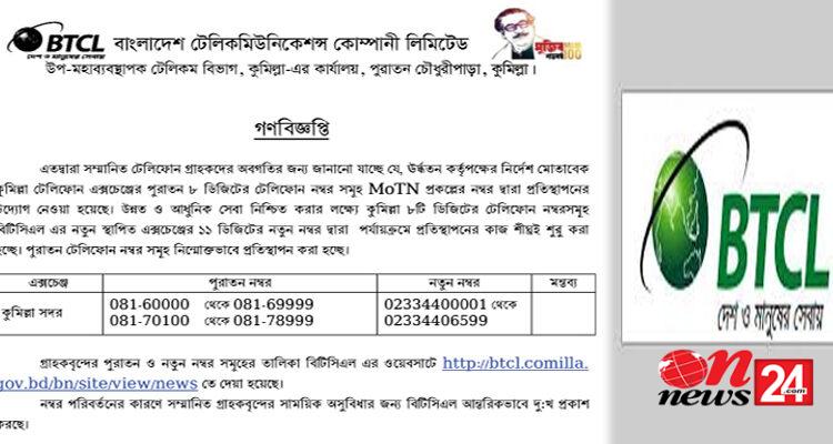 ডিজিটাল বাংলাদেশে কুমিল্লাবাসীকে আধুনিক ও উন্নত সেবা প্রদানের লক্ষকে সামনে রেখে পূর্বের ৮ ডিজিটের টেলিফোন নম্বর সমূহকে বিটিসিএল এর নতুন স্থাপিত এক্সচেঞ্জের ১১ ডিজিটের নতুন নম্বর দ্বারা পর্যায়ক্রমে অতি দ্রুততম সময়ে প্রতিস্থাপনের কাজ শুরু হবে। গ্রাহকদের বুঝার সুবিধার্থে বিজ্ঞপ্তিতে প্রতিস্থাপনের একটি ছক উল্লেখ করা হয়েছে। এছাড়াও গ্রাহকের পুরাতন ও প্রতিস্থাপিত নতুন নম্বরের তালিকা বিটিসিএল এর নির্ধারিত ওয়েবসাইটে নিয়মিত আপলোড করা হচ্ছে।