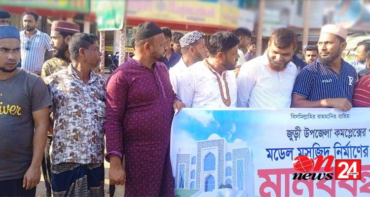 জুড়ীতে উপজেলা কমপ্লেক্সের পাশে মডেল মসজিদ নির্মাণের দাবিতে মানববন্ধন