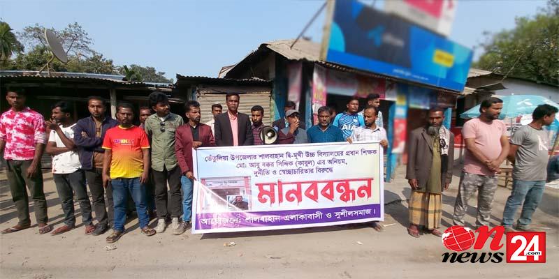 শালবাহান এলাকাবাসী ও সুশীলসমাজ ব্যানারে বুধবার (৬ মার্চ) বিকেলে তেঁতুলিয়া উপজেলার শালবাহান বাজারের আঞ্চলিক সড়কে ঘন্টাব্যাপী এ মানববন্ধন ও বিক্ষোভ করে তারা।