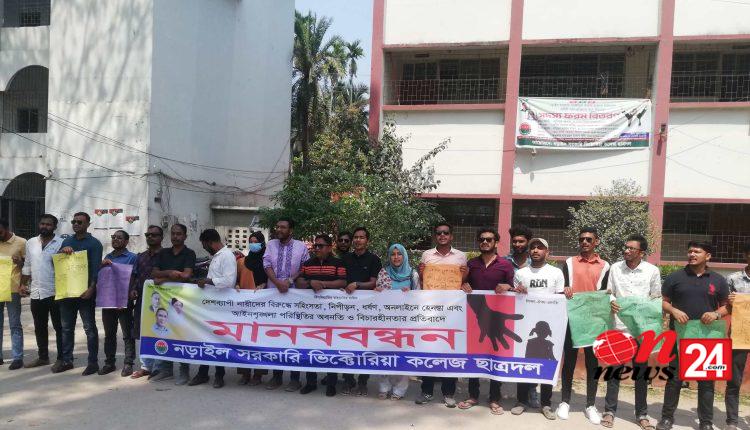 প্রতিবাদে মানববন্ধন করেছে নড়াইল জেলা ছাত্রদল। সোমবার (১০ মার্চ) দুপুর ১২