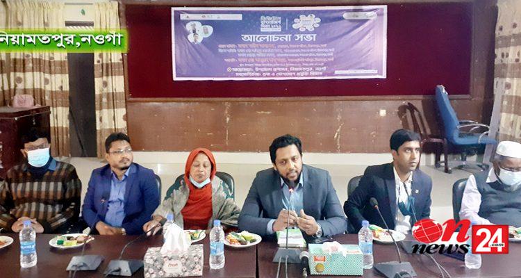রবিবার দুপুর ১২ টায় উপজেলা প্রশাসনের আয়োজনে উপজেলা পরিষদ মিলনায়তনে আলোচনা সভা অনুষ্ঠিত হয়। সহকারী কমিশনার(ভূমি) মনজুরুল আলমের সভাপতিত্বে ও উপজেলা আইসিটি কর্মকর্তা রাসেল রানার সঞ্চালনায় সভায় বিশেষ অতিথি হিসেবে উপস্থিত ছিলেন, উপজেলা পরিষদের মহিলা ভাইস চেয়ারম্যান ও উপজেলা মহিলা আওয়ামী লীগের সভাপতি নাদিরা বেগম, উপজেলা স্বাস্থ্য ও পরিবার পরিকল্পনা অফিসার ডাঃ তোফাজ্জল হোসেন, উপজেলা কৃষি অফিসার আমীর আব্দুল্লাহ ওয়াহিদুজ্জামান, উপজেলা প্রকল্প বাস্তবায়ন কর্মকর্তা তরিকুল ইসলাম, উপজেলা মহিলা বিষয়ক কর্মকর্তা নিলুফার ইয়াসমিন, উপজেলা একাডেমিক সুপারভাইজার জাকির হোসেন, উপজেলা রির্সোস সেন্টারের ইন্টাট্রাক্টর তমা চৌধুরী, নিয়ামতপুর উপজেলা প্রেসক্লাবের সাধারণ সম্পাদক জনি আহমেদ ও যুগ্ম সাধারণ সম্পাদক রফিকুল ইসলাম প্রমুখ।