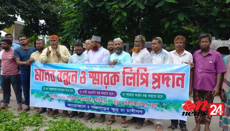পঞ্চগড়ের দেবীগঞ্জ উপজেলায় চায়ের সবুজ পাতার ন্যায্য মূল্য নিশ্চিত, চা পাতার দাম কর্তন ও চা চাষীদের হয়রানি বন্ধ সহ ৮ দফা দাবিতে মানববন্ধন, বিক্ষোভ মিছিল ও স্মারক লিপি প্রদান করেছে চা চাষীরা।
