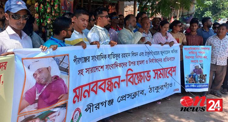 দৈনিক মানব কন্ঠের পীরগঞ্জ প্রতিনিধি লাতিফুর রহমান লিমন ও প্রতিদিনের সংবাদের ঠাকুরগাঁও প্রতিনিধি জুনায়েদ কবির সহ সারাদেশে সাংবাদিক নির্যাতনের প্রতিবাদে মানব বন্ধন ও বিক্ষোভ সমাবেশ অনুষ্ঠিত হয়েছে ঠাকুরগাঁওয়ের পীরগঞ্জে।