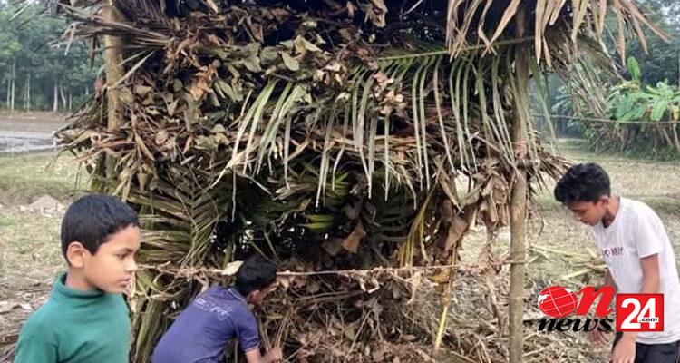 ছোটদের সহযোগিতা করতে কাজে হাত লাগান বড়রাও। এই বাঁশ ও নাড়ার ঘরেও ফুটিয়ে তোলা হয় নান্দনিকতা। কেউ এই ঘর তৈরি করেন অতি সাধারণভাবে দোচালা, কেউ চার চালা আবার কেউ তৈরি করেন দোতলা ঘর।