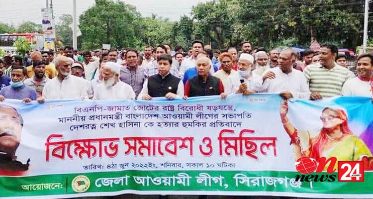 সিরাজগঞ্জ জেলা আওয়ামী লীগের আযোজনে বিএনপি, জামাত জোটের রাস্ট্র বিরোধি ষড়যন্ত্রে মাননীয় প্রধানমন্ত্রী, বাংলাদেশ আওয়ামীলীগের সভাপতি, দেশ রত্ন শেখ হাসিনাকে হত্যার হুমকির প্রতিবাদে বিক্ষোভ সমাবেশ অনুষ্ঠিত হয়েছে।