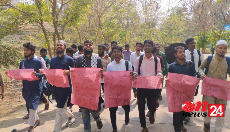 এসময় শিক্ষার্থীরা, ফ্রম দ্য রিভার টু দ্য সী, প্যালেস্টাইন উইল বি ফ্রি, লং লিভ প্যালেস্টাইন, থ্রোর এভরি হার্ড টাইম, লং লিভ প্যালেস্টাইন, অ্যাগেইনস্ট দ্য ক্রুয়েল টাইম, লং লিভ প্যালেস্টাইন, ফর পিচ্ ইন টাইম, ফ্রি ফ্রি ফ্রি প্যালেস্টাইন, নো ম্যুর জেনোসাইড, ফ্রি ফ্রি প্যালেস্টাইন, নো জাস্টিস, নো পিচ্, ফ্রি প্যালেস্টাইন ইত্যাদি লিখা প্লেকার্ড হাতে নিয়ে দাঁড়ায়।