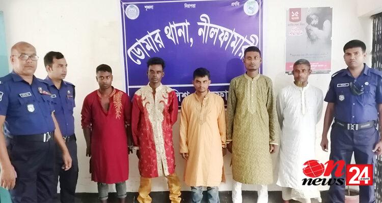 আটককৃতরা হলেন, জলঢাকা উপজেলার ধর্মপাল তহশিলদার পাড়া এলাকার মৃত মজির উদ্দিনের ছেলে বর রবিউল ইসলাম(২৫), তার চাচা মনছুর আলী(৫৫), মনছুর আলীর দুই ছেলে মঞ্জুরুল ইসলাম(২৩) ও আলীমুল ইসলাম(২০) এবং রবিউলের নিকট আত্মীয় পাশবর্তী দেবীগঞ্জ উপজেলার সোনাহার নুল্লা পাড়া এলাকার মৃত জহুর আলীর ছেলে আল আমীন(২৮)।