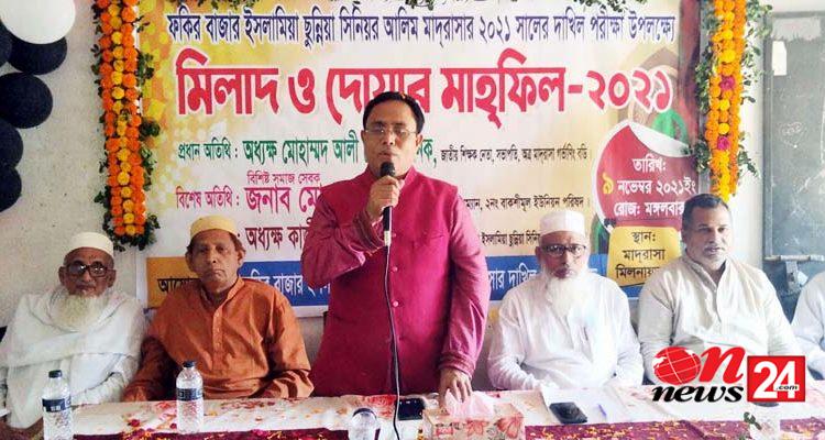 এতে প্রধান অতিথি হিসেবে বক্তব্য রাখেন জাতীয় শিক্ষক নেতা ও ফকিরবাজার ইসলামিয়া ছুন্নিয়া সিনিয়র আলিম মাদ্রাসার সভাপতি অধ্যক্ষ মোহাম্মদ আলী চৌধুরী মানিক। মাদ্রাসার অধ্যক্ষ মাও. কাজী আবুল বাসারের সভাপতিত্বে এবং প্রভাষক এম. সাইফুল ইসলামের সঞ্চালনায় বক্তব্য রাখেন সাবেক সভাপতি হাজী আ: ওহাব মাস্টার, সহকারি অধ্যাপক আ: খালেক, অত্র মাদ্রাসার গভর্ণিং বডির সদস্য হাজী তফাজ্জল হোসেন, অভিভাবক সদস্য কাজী বাহার মিয়া, দাতা সদস্য হাজী মনিরুল হক আরিফ, বীর মুক্তিযোদ্ধা কাজী আবুল কাশেম, খারেরা সরকারি প্রা: বিদ্যালয়ের সাবেক সভাপতি আবদুস ছালাম, বর্তমান সভাপতি এম. আবদুল কাইয়ুম, কাজী তাজুল ইসলাম।