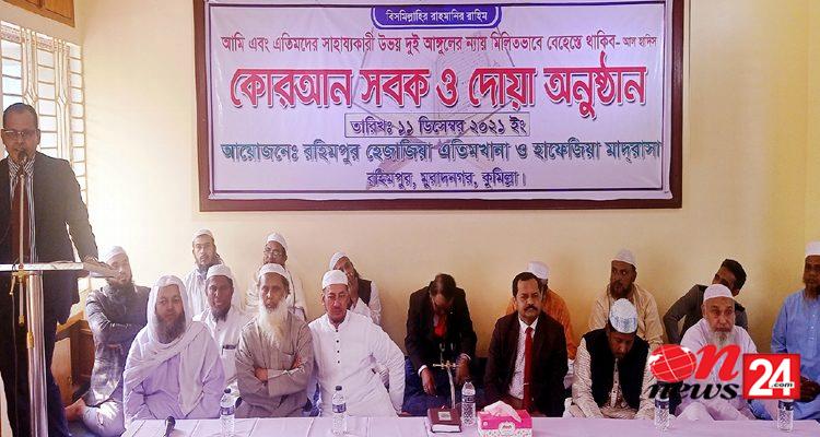 কুমিল্লার মুরাদনগর উপজেলার ঐতিহ্যবাহী রহিমপুর হেজাজিয়া এতিমখানা ও হাফেজিয়া মাদরাসার ৪০ জন শিক্ষার্থীকে পবিত্র কোরআন শরীফের সবক প্রদান করা হয়েছে। শনিবার দুপুরে মাদরাসা মিলনায়তনে আনুষ্ঠানিক ভাবে ওই সবক প্রদান করেন, হেফাজতে ইসলামের মহাসচিব আল্লামা শায়েখ সাজিদুর রহমান।