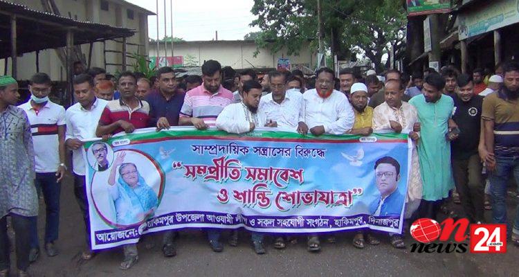 হাকিমপুর উপজেলা ও পৌর আওয়ামীলীগসহ সহযোগী সংগঠনের আয়োজনে মঙ্গলবার বিকেল ৫টায় হিলি বাজারস্থ আওয়ামীলীগ দলীয় কার্যালয়ের সামনে থেকে শান্তি শোভাযাত্রা বের করা হয়। শোভাযাত্রাটি হিলি বাজারসহ স্থলবন্দরের প্রধান প্রধান সড়ক প্রদক্ষিন শেষে আবারো একই স্থানে গিয়ে শেষ হয়। পরে খাদ্যগুদাম মোড়ে সম্প্রতি সমাবেশ অনুষ্ঠিত হয়। এতে বক্তারা হিন্দু সম্প্রদায়ের বাড়ি ঘরে হামলার তীব্র নিন্দা জানান। একইসাথে যারা সাম্প্রদায়িক সম্প্রতি বিনষ্টের চেষ্টা করছেন তাদেরকে আইনের আওতায় আনার দাবী জানান। সেই সাথে সাম্প্রদায়িক স¤প্রতি রক্ষায় আওয়ামীলীগ মাঠে থাকবে ও তাদের সেই ষড়যন্ত্র রুখে দিবে বলেও জানান বক্তারা।