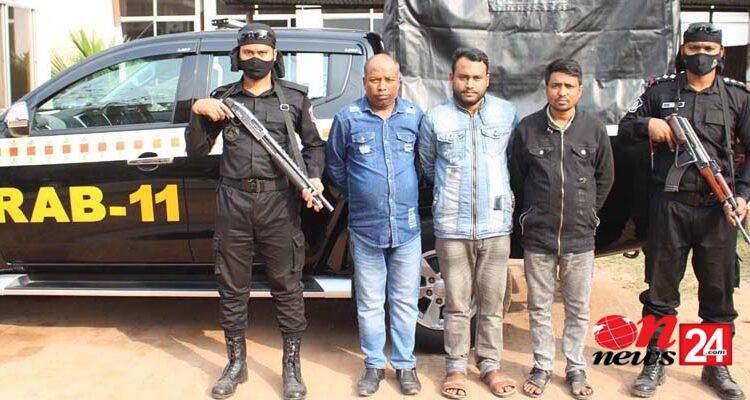 র্যাব-১১ সহকারী পরিচালক এএসপি মো. রিজওয়ান সাঈদ জিকু স্বাক্ষরিত এক প্রেস বিজ্ঞপ্তিতে বুধবার দুপুরে এ তথ্য নিশ্চিত করেন। গ্রেফতারকৃতরা হলো সিদ্ধিরগঞ্জের সানারপাড় এলাকার মৃত আব্দুল করিমের ছেলে এসএম আবু রাসেল স্বপন, একই এলাকার মো. মজনু মিয়ার ছেলে মো. জাবেদ ওমর ও বগুড়ার ধুনট থানার চর খাদুলি এলাকার মোঃ আবু বক্কর শেখের ছেলে মো. মুকুল হোসেন শেখ। এ সময় মাদক পরিবহনের কাজে ব্যবহৃত একটি প্রাইভেটকার ও একটি মোটরসাইকেল জব্দ করা হয়। গ্রেফতারকৃতদের সোনারগাঁও থানায় মামলা দায়েরের পর হস্তান্তরের প্রক্রিয়া চলছে।