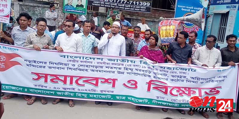 নড়াইলের দিখলিয়া ও লোহাগড়ায় শত শত হিন্দু ঘরবাড়ি লুটপাট, ভাংচুর, অগ্নিসংযোগ, মন্দিরের শিব বিগ্রহে উগ্র সাম্প্রদায়িক হামলার নিন্দা ও প্রতিবাদে বিক্ষোভ সমাবেশ কর্মসূচী পালন করেছে বাংলাদেশ জাতীয় হিন্দু মহাজোট, নীলফামারী জেলা শাখা।