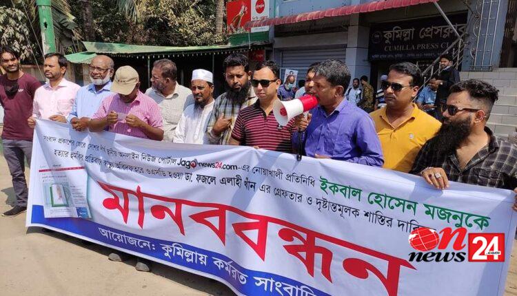 অনলাইন নিউজ পোর্টাল জাগো নিউজের নোয়াখালী প্রতিনিধি ইকবাল হোসেন মজনুকে প্রাণনাশের হুমকির প্রতিবাদে কুমিল্লায় মানববন্ধন অনুষ্ঠিত হয়েছে।