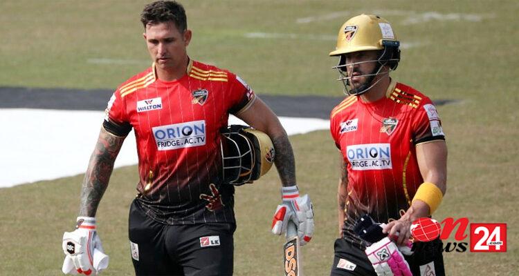 দুর্দান্ত ব্যাটিংয়ে ফিফটির দিকে ছুঁটছিলেন লিটন। তবে ইনিংসের ১১তম ওভারে নাসুমের বলে ধরা পড়েন সাব্বিরের হাতে। ৫টি চার ও ১টি ছয়ের মারে ৩৪ বলে ৪৭ রানে থামেন লিটন। চারে নেমে সুবিধা করতে পারেননি অধিনায়ক ইমরুল কায়েস। বেনি হাওয়েলের বলে বোল্ড হন ১ রান করে। এরপর ব্যাট হাতে ধ্বংসলীলা চালিয়ে ফিফটির স্বাদ পান ফাফ। তার সঙ্গে যোগ যেন তারই স্বদেশী দক্ষিণ আফ্রিকান ব্যাটসম্যান ক্যামেরুন ডেলপোর্ট।