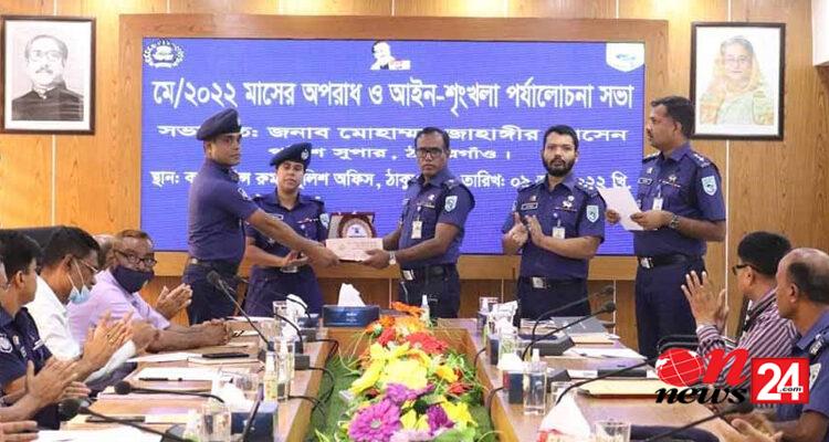 বৃহস্পতিবার (৯ জুন) দুপুরে জেলা পুলিশ সুপারের সম্মেলন কক্ষে মাসিক অপরাধ ও আইন-শৃঙ্খলা পর্যালোচনা সভায় আনুষ্ঠানিকভাবে শ্রেষ্ঠ অফিসার ইনচার্জ হিসেবে সদর থানার ওসি তানভিরুল ইসলামের হাতে পুরস্কার ও ক্রেস্ট তুলে দেন ঠাকুরগাঁও পুলিশ সুপার মোহাম্মদ জাহাঙ্গীর হোসেন।