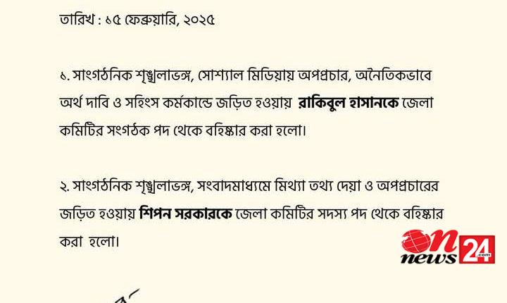 মূখ্য সংগঠক সাদিকুর রহমান ওই পত্রে উল্লেখ করেন, সাংগঠনিক শৃঙ্খলা ভঙ্গ, সোশ্যাল মিডিয়ায় অপপ্রচার, অনৈতিকভাবে অর্থ দাবি ও সহিংস কর্মকাণ্ডে জড়িত হওয়ায় রাকিবুল হাসানকে জেলা কমিটির সংগঠক পদ থেকে এবং সাংগঠনিক শৃঙ্খলা ভঙ্গ, সংবাদমাধ্যমে মিথ্যা তথ্য দেওয়া ও অপপ্রচারের জড়িত হওয়ায় শিপন সরকারকে জেলা কমিটির সদস্য পদ থেকে বহিষ্কার করা হলো।