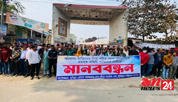 অযোগ্য লোক দিয়ে গঠন করা কুমিল্লা জেলা ক্রীড়া সংস্থার এডহক কমিটি বাতিলের জন্য মানববন্ধন ও স্মারকলিপি