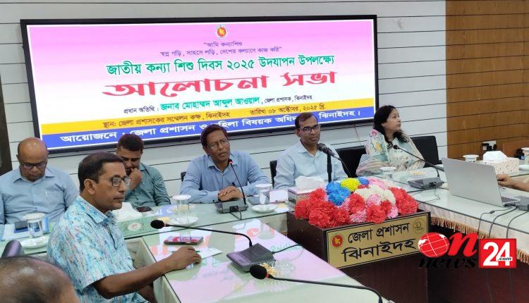 ‘আমি কন্যা শিশু,স্বপ্ন গড়ি,সাহসে লড়ি,দেশের কল্যাণে কাজ করি’এই প্রতিপাদ্য নিয়ে ঝিনাইদহে জাতীয় কন্যা শিশু দিবস উদযাপন করা হয়েছে। এ উপলক্ষে ঝিনাইদহ জেলা প্রশাসকের সম্মেলন কক্ষে জেলা প্রশাসন ও মহিলা বিষয়ক অধিদপ্তরের আয়োজনে বুধবার (৮ অক্টোবর) সকাল ১০ টায় এক আলোচনা সভা অনুষ্ঠিত হয়। অতিরিক্ত জেলা প্রশাসক (সার্বিক) সাইফুর রহমানের সভাপতিত্বে অনুষ্ঠিত সভায় প্রধান অতিথি ছিলেন জেলা প্রশাসক মোহাম্মদ আব্দুল আওয়াল,বিশেষ অতিথি ছিলেন পরিবার পরিকল্পনা বিভাগের উপপরিচালক মোজাম্মেল করিম, এলজিইডি’র নির্বাহী প্রকৌশলী মনোয়ার উদ্দীন। বক্তব্য রাখেন ঝিনাইদহ জেলা রিপোর্টার্স ইউনিটির সভাপতি এম এ কবীর, দোকান মালিক সমিতির সভাপতি আনোয়ারুল ইসলাম বাদশা,তহুরা খাতুন,নাছরিন ইসলাম এবং মিরাজ হোসেন। অনুষ্ঠানে স্বাগত বক্তব্য রাখেন মহিলা বিষয়ক অধিদপ্তরের উপপরিচালক ইসরাত জাহান।