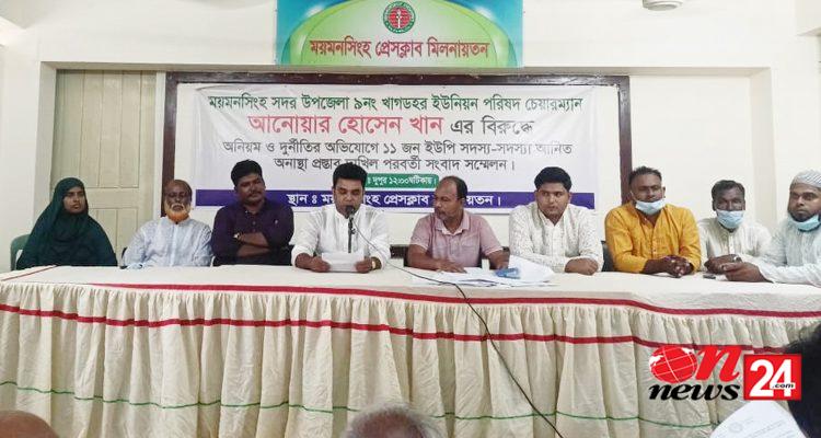 ময়মনসিংহ সদর উপজেলার খাগডহর ই্উনিয়ন পরিষদ চেয়ারম্যান মো. আনোয়ার হোসেন খানের বিরুদ্ধে অর্থ আত্মসাত, অনিয়ম-দূর্নীতির প্রতিবাদে সংবাদ সম্মেলন করেছে ইউপি সদস্যরা।