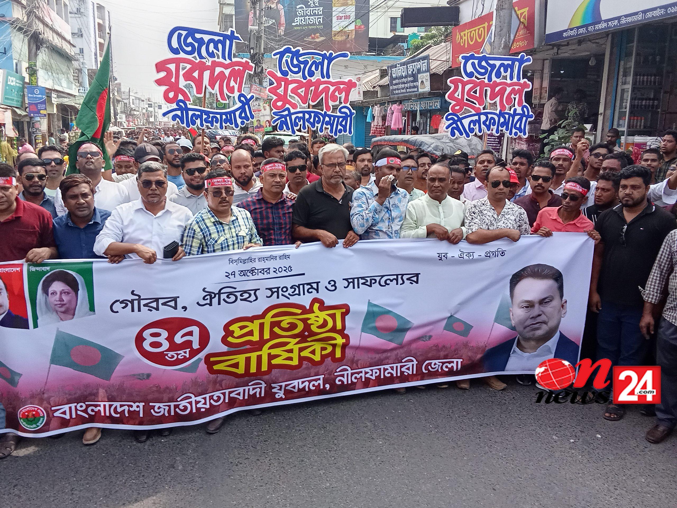 বাংলাদেশ জাতীয়তাবাদী যুবদলের ৪৭তম প্রতিষ্ঠাবার্ষিকী উপলক্ষে নীলফামারীতে আলোচনা সভা ও র্যালি অনুষ্ঠিত হয়েছে।