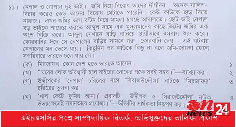 গত রোববার (৬ নভেম্বর) সারাদেশে এইচএসসি বাংলা প্রথমপত্রের পরীক্ষা অনুষ্ঠিত হয়। পরীক্ষার ১১ নাম্বার প্রশ্নে বলা হয়েছে, ‘নেপাল ও গোপাল দুই ভাই। জমি নিয়ে বিরোধ তাদের দীর্ঘদিন। অনেক সালিস বিচার করেও কেউ তাদের বিরোধ মেটাতে পারেনি। কেউ কাউকে ছাড় দিতে নারাজ। এখন জমির ভাগ বণ্টন নিয়ে মামলা চলছে আদালতে। ছোট ভাই নেপাল বড় ভাইকে শায়েস্তা করতে আব্দুল নামে এক মুসলমানের কাছে ভিটের জমির এক অংশ বিক্রি করে। আব্দুল সেখানে বাড়ি বানিয়ে স্থায়ীভাবে বসবাস শুরু করে। কোরবানির ঈদে সে নেপালের বাড়ির সামনে গরু কোরবানি দেয়। এই ঘটনায় নেপালের মন ভেঙে যায়। কিছুদিন পর কাউকে কিছু না বলে জমি-জায়গা ফেলে সপরিবারে ভারতে চলে যায় সে।’