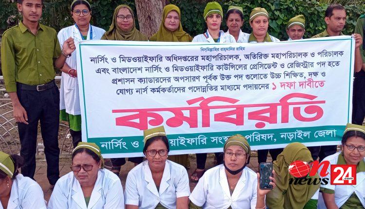 নার্সিং ও মিডওয়াইফারি অধিদপ্তরের মহাপরিচালক, অতিরিক্ত মহাপরিচালক, পরিচালক এবং বাংলাদেশ নার্সিং ও মিডওয়াইফারি কাউন্সিলের প্রেসিডেন্ট ও রেজিষ্ট্রার পদ থেকে সকল ক্যাডার কর্মকর্তাদের অপসারণপূর্বক উক্ত পদগুলোতে নার্সিং কর্মকর্তাদের পদায়নের ১ দফা দাবিতে নড়াইলে নার্সদের ৫ ঘন্টা কর্মবিরতি পালিত হয়েছে।