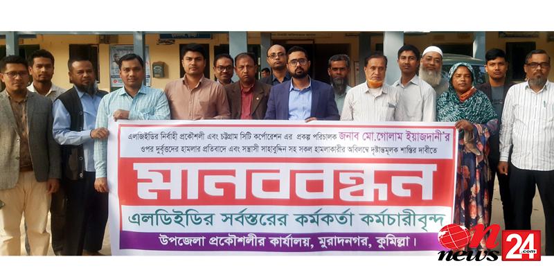 চট্টগ্রাম সিটি করপোরেশনের আড়াই হাজার কোটি টাকার উন্নয়ন প্রকল্পের কাজ না পেয়ে চসিক প্রকল্প পরিচালক গোলাম ইয়াজদানীর উপর হামলার প্রতিবাদে কুমিল্লার মুরাদনগরে মানববন্ধন কর্মসূচি পালিত হয়েছে। সোমবার বিকেলে উপজেলা প্রকৌশলী মোহাম্মদ রায়হানুল আলম চৌধুরীর নেতৃত্বে আয়োজিত উপজেলা পরিষদের সামনে অনুষ্ঠিত মানববন্ধন কর্মসূচিতে উপস্থিত ছিলেন, সহকারী প্রকৌশলী ইদ্রিস আলী, উপ-সহকারী প্রকৌশলী মাসুদুর রহমান, রাসেল মিয়া, হিসাব রক্ষক রুহুল আমিন ও সার্ভেয়ার সাইফুল ইসলামসহ এলজিইডি দপ্তরের কর্মকর্তা-কর্মচারীবৃন্দ।