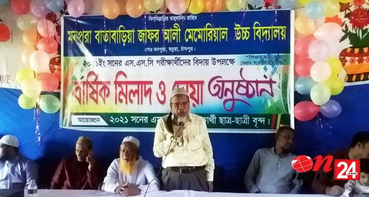 চাঁদপুরের কচুয়া উপজেলার মনপুরা বাতাবাড়িয়া জাফর আলী মেমোরিয়াল উচ্চ বিদ্যালয়ে এসএসসি পরীক্ষার্থীদের বিদায় উপলক্ষে বার্ষিক মিলাদ ও দোয়া অনুষ্ঠিত হয়েছে। মঙ্গলবার সকালে বিদ্যালয়ের মিলনায়তনে এ দোয়া মাহফিল অনুষ্ঠিত হয়।