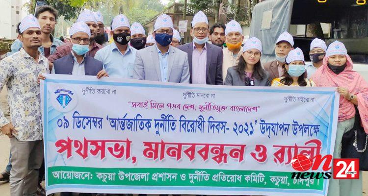 সবাই মিলে গড়বো দেশ, দূর্নীতিমুক্ত বাংলাদেশ এ প্রতিপাদ্যে কচুয়ায় দূর্নীতি প্রতিরোধ দিবস পালিত হয়েছে। বৃহস্পতিবার উপজেলা প্রসাশন ও উপজেলা দূর্নীতি প্রতিরোধ কমিটির উদ্যোগে র্যালী, মানববন্ধন ও পথসভা অনুষ্ঠিত হয়।