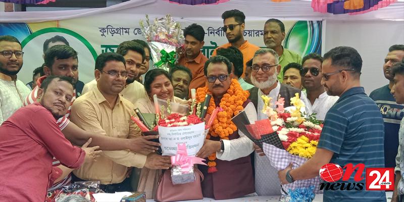 শুক্রবার সকাল ১১টায় ঢাকা থেকে আসার পথে সদর উপজেলার কাঁঠালবাড়ীতে জেলা আওয়ামী লীগ,অংগসংগঠনসহ ৯উপজেলার নেতাকর্মী কয়েক হাজার মোটরসাইকেল বহর নিয়ে সদর ডাকবাংলো চত্বরে আসলে নবনির্বাচিত কুড়িগ্রাম জেলা পরিষদ চেয়ারম্যান আ ন ম ওবায়দুর রহমানকে হাজার হাজার মানুষের উপস্থিতে ফুলের মালা পরিয়ে গণসংবর্ধনা দেওয়া হয়।