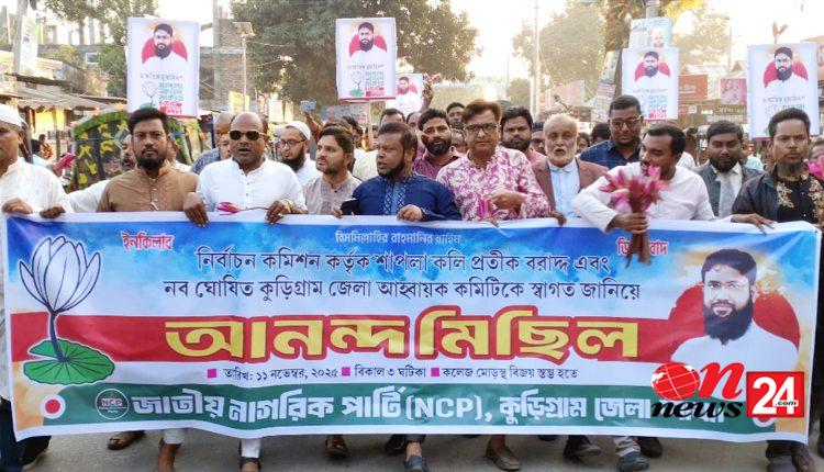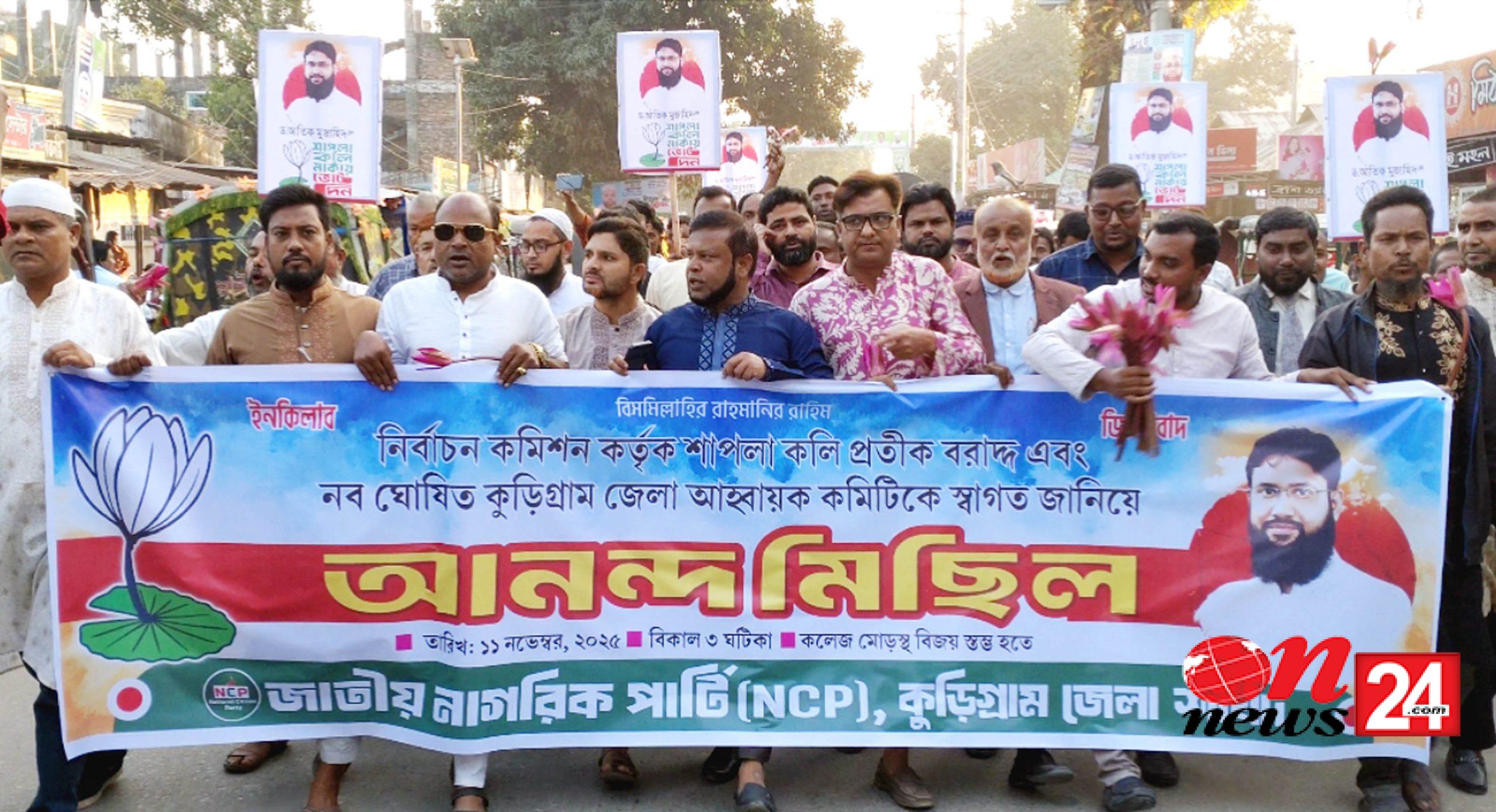 নির্বাচন কমিশন কর্তৃক শাপলা কলি প্রতীক বরাদ্দ ও নব ঘোষিত কুড়িগ্রাম জেলা আহ্বায়ক কমিটিকে স্বাগত জানিয়ে আনন্দ মিছিল ও সমাবেশ করেছে জাতীয় নাগরিক পার্টি (এনসিপি), কুড়িগ্রাম জেলা শাখা।