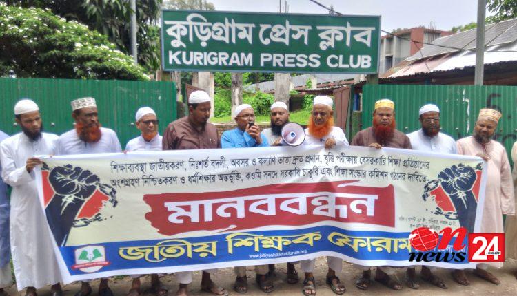 কুড়িগ্রামে জাতীয় শিক্ষক ফোরাম জেলা শাখার আয়োজনে মানববন্ধন অনুষ্ঠিত।