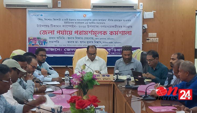 কুড়িগ্রামে “শিশু, কিশোর-কিশোরী ও নারী উন্নয়নে সচেতনতামূলক প্রচার কার্যক্রম” প্রকল্পের আওতায় ইউনিসেফ বাংলাদেশের আর্থিক সহায়তায় টাইফয়েড টিকাদান ক্যাম্পেইন-২০২৫ উপলক্ষে গণমাধ্যমকর্মীদের সমন্বয়ে জেলা পর্যায়ে পরামর্শমূলক কর্মশালা অনুষ্ঠিত হয়েছে।