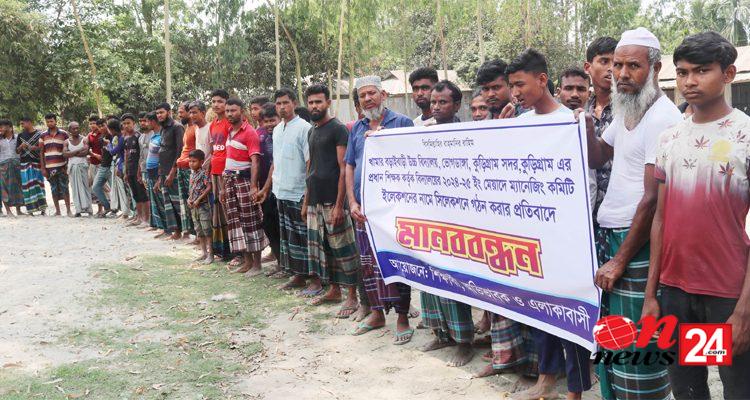 কুড়িগ্রামে বিদ্যালয়ে নির্বাচন ছাড়াই প্রধান শিক্ষকের মনগড়া ম্যানেজিং কমিটি গঠনের প্রতিবাদে মানববন্ধন করেছে এলাকাবাসী।