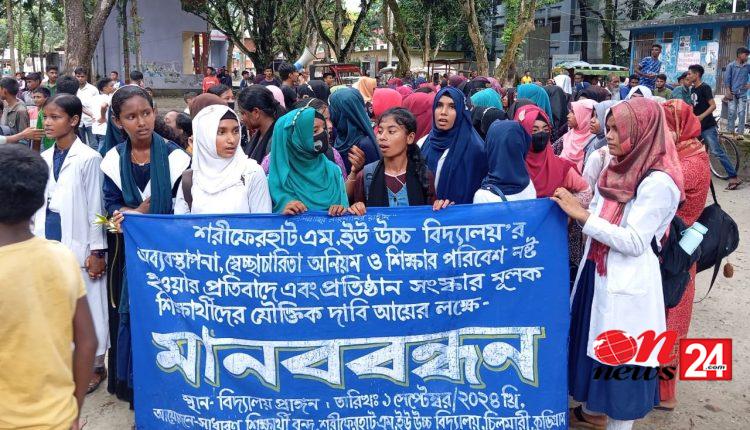 কুড়িগ্রামের চিলমারীতে নানা অনিয়মের অভিযোগ তুলে শরীফের হাট এম ইউ উচ্চ বিদ্যালয়ের প্রধান শিক্ষক আব্দুর রউফের পদত্যাগ দাবিতে আন্দোলনে নেমেছে শিক্ষার্থীরা। গত- ৩১ আগস্ট থেকে আন্দোলন করছে শিক্ষার্থীরা। মঙ্গলবার (৩ সেপ্টেম্বর) দুপুরে প্রতিষ্ঠানটির সাবেক শিক্ষার্থী মাসুদ মিয়ার নেতৃত্বে প্রতিষ্ঠানটি থেকে ব্যানার হাতে শিক্ষার্থীরা বিক্ষোভ মিছিল নিয়ে উপজেলা পরিষদ চত্ত্বরে সমাবেশ করে। এ সময় পদত্যাগ চেয়ে শিক্ষার্থীরা বিভিন্ন স্লোগানে স্লোগানে মুখরিত করে পরিষদ প্রাঙ্গন।