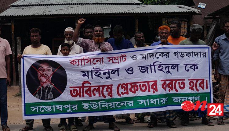 মানববন্ধন ও বিক্ষোভ মিছিলে অংশগ্রহণকারী  এরশাদুল বলেন আমাদের অএ এলাকায় মাদক, ক্যাসিনোর মুল হোতা মাইনুল ইসলাম ও জাহিদুল সিন্ডিকেট গড়ে দীর্ঘ দিন যাবৎ ব্যবসা করে আসছেন।