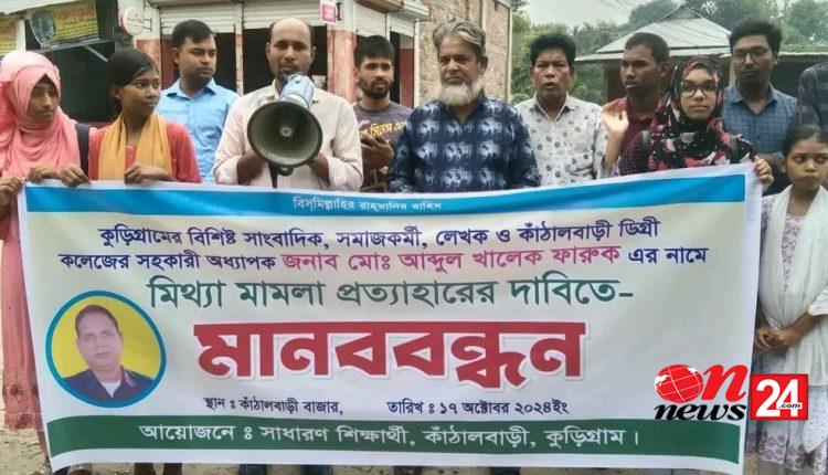 কলেজছাত্র আশিক হত্যা মামলায় কুড়িগ্রামের লেখক ও কাঁঠালবাড়ী ডিগ্রি কলেজের সহকারী অধ্যাপক আব্দুল খালেক ফারুকের নাম অন্তর্ভুক্তেরর প্রতিবাদ ও মিথ্যা মামলা প্রত্যাহারের দাবীতে মানববন্ধন করেছেন সাধারণ শিক্ষার্থীরা।