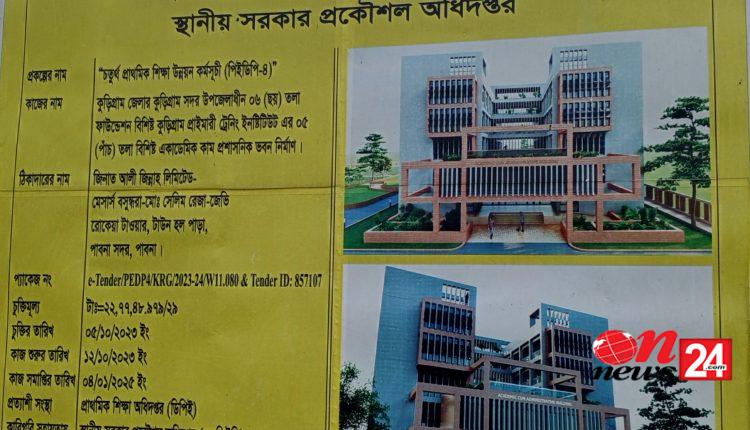 জানাগেছে,চতুর্থ প্রাথমিক শিক্ষা উন্নয়ন কর্মসুচী(পিইডিপি-৪)প্রকল্পের আওতায় কুড়িগ্রাম জেলার সদর উপজেলাধীন ৬(ছয়)তলা ফাউন্ডেশন বিশিষ্ট কুড়িগ্রাম প্রাইমারী ট্রেনিং ইনস্টিটিউট এর ৫(পাঁচ) তলা বিশিষ্ট একাডেমিক কাম প্রশাসনিক ভবন নির্মাণ হচ্ছে। যার প্যাকেজ নং-e-tender/PEDP-4/krg/2023-24/wll.080& tender ID:857107, কাজের দরপত্র মুল্য ২৪,২৩,৩৪,৩০০/-টাকা। কাজের চুক্তি মুল্য ২২,৭৭,৪৮,৯৭৯/২৯ টাকা। কাজ শুরুর তারিখ, ১২/১০/২০২৩ইং এবং কাজ সমাপ্তির তারিখ দেয়া হয়েছে ৪/১/২০২৫ ইং পযন্ত। কাজটির ভিত্তি প্রস্তর স্থাপন প্রাথমিক ও গণশিক্ষা মন্ত্রণালয়ের ততকালীন প্রতিমন্তী মোঃ জাকির হোসেন এমপি। তার সাথে আরো উপস্থিত ছিলেন, প্রাথমিক শিক্ষা অধিদপ্তরের মহাপরিচালক (গ্রেড-১) শাহ রেজওয়ান হায়াত। কাজটির বাস্তবায়নে প্রাথমিক শিক্ষা অধিদপ্তর (ডিপিই)এবং কারিগরি সহায়তায় রয়েছেন স্থানীয় সরকার প্রকৌশল অধিদপ্তর এলজিইডি, কুড়িগ্রাম সদর, কুড়িগ্রাম। কাজটির ঠিকাদারি সংস্থা, জিনাত আলী জিন্নাহ লি:মেসাস্ বসুন্ধরা মোঃ সেলিম রেজা জেভি,রোকেয়া টাওয়ার,পাবনা।