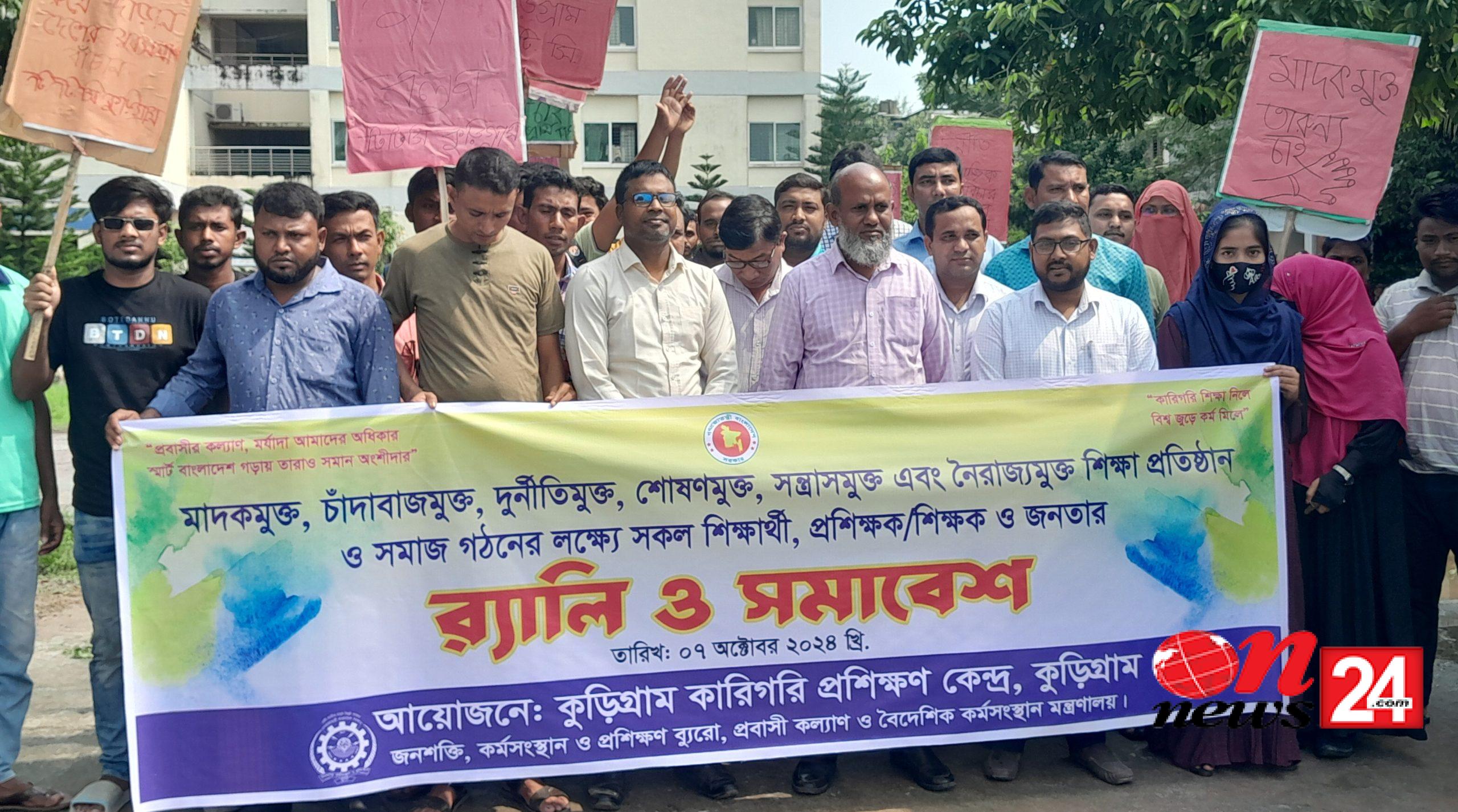 কুড়িগ্রামে কারিগরি প্রশিক্ষণ কেন্দ্রের আয়োজনে সোমবার সকাল ১১:৩০ মিনিটে মাদকমুক্ত, চাঁদাবাজ মুক্ত, দুনীতিমুক্ত , শোষণমুক্ত,সন্ত্রাসমুক্ত এবং নৈরাজ্যমুক্ত শিক্ষা প্রতিষ্ঠান ও সমাজ গঠনের লক্ষ্যে এক র্্যালী ও সমাবেশ অনুষ্ঠিত হয়। উক্ত র্্যালী ও সমাবেশে অংশগ্রহণ করেন কুড়িগ্রাম কারিগরি প্রশিক্ষণ কেন্দ্রের সকল শিক্ষক / প্রশিক্ষক ও জনতা। র্্যালীটি কারিগরি প্রশিক্ষণ কেন্দ্র থেকে বাহির হয়ে শহরের কলেজ মোড়, শাপলা চত্বর ও বাস স্টান্ডসহ বিভিন্ন এলাকা প্রদক্ষিণ শেষে কারিগরি প্রশিক্ষণ কেন্দ্রের এক আলোচনা সভায় মিলিত হয়।