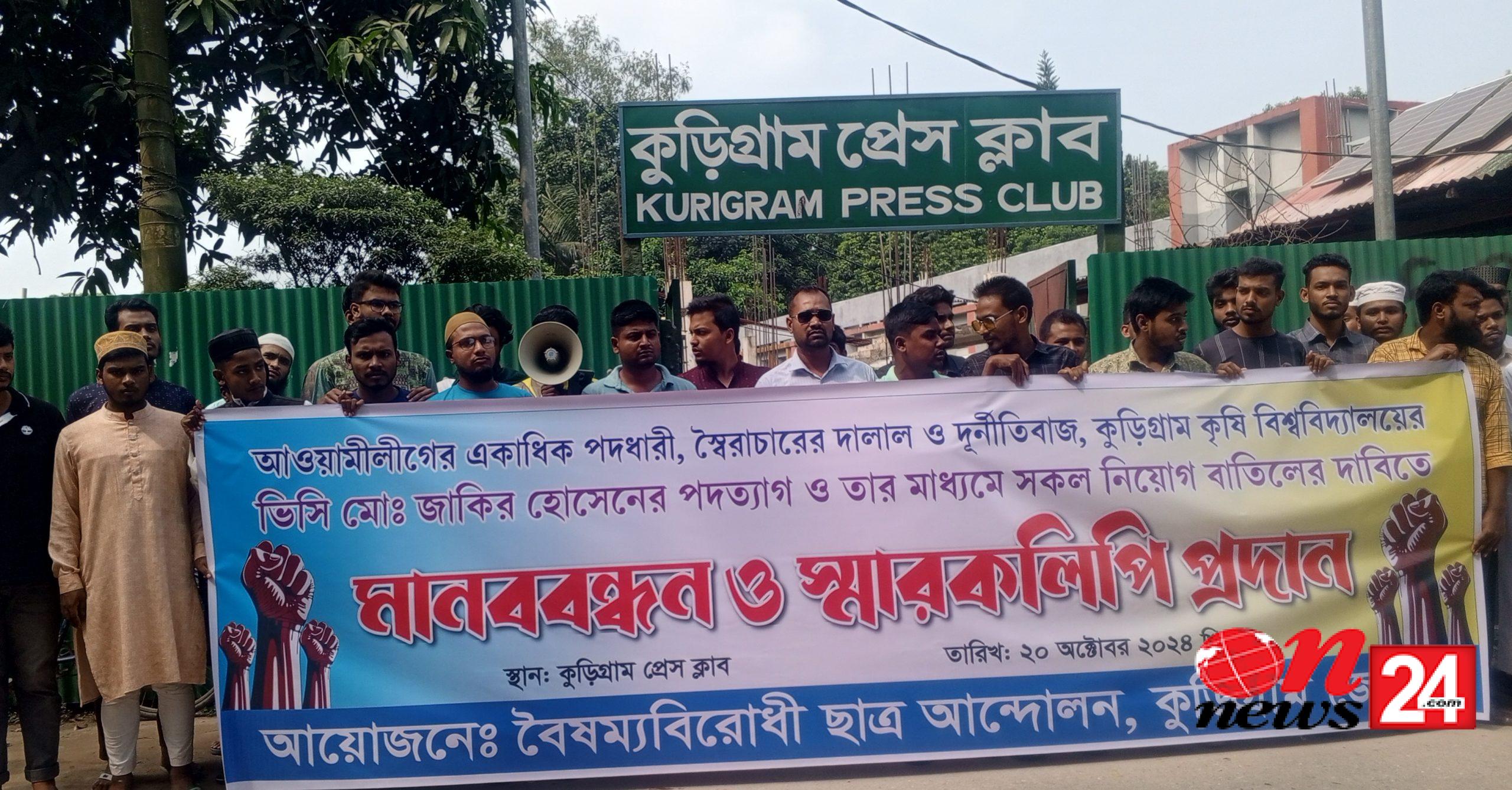 কুড়িগ্রাম কৃষি বিশ্ববিদ্যালয়ের ভাইস চ্যানচেলর (ভিসি) জাকির হোসেনের পদত্যাগ দাবিতে মানববন্ধন করেছে বৈষম্য বিরোধী ছাত্র জনতা। রবিবার সকালে বৈষম্য বিরোধী ছাত্র জনতার ব্যানারে কুড়িগ্রাম প্রেসক্লাবের সামনে ঘন্টাকালব্যাপী মানববন্ধন অনুষ্ঠিত হয়।