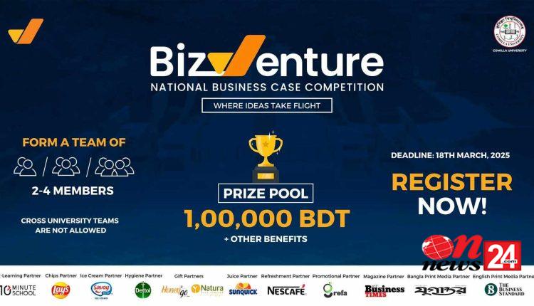 কুমিল্লা বিশ্ববিদ্যালয়ে (কুবি) প্রথমবারের মতো আয়োজিত হতে যাচ্ছে জাতীয় বিজনেস কেস প্রতিযোগিতা ‘বিজভেঞ্চার’। উক্ত প্রতিযোগিতায় বিজয়ীদের জন্য রয়েছে এক লক্ষ টাকা পুরস্কার।