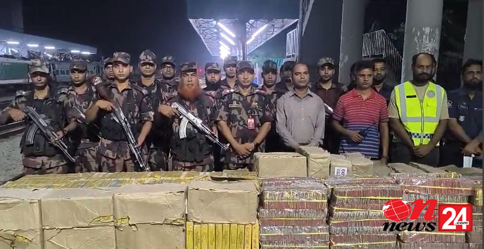 কুমিল্লার সদর দক্ষিণ উপজেলার রসুলপুর রেলওয়ে স্টেশনে বিশেষ টাস্কফোর্স অভিযানে বিপুল পরিমাণ ভারতীয় বাজি আটক করেছে বিজিবি। আটককৃত বাজির আনুমানিক বাজারমূল্য এক কোটি সাইত্রিশ লাখ দশ হাজার টাকা।বিজিবি সূত্রে জানা গেছে, গতকাল মঙ্গলবার রাতে গোপন সংবাদের ভিত্তিতে সহকারী কমিশনার ও এক্সিকিউটিভ ম্যাজিস্ট্রেট মো. সরোয়ার জাহানের উপস্থিতিতে অভিযান চালানো হয়। কুমিল্লা ব্যাটালিয়ন (১০ বিজিবি)-এর এ্যাডজুটেন্টের নেতৃত্বে বিজিবি, জেলা পুলিশ, রেলওয়ে পুলিশ ও সাধারণ পুলিশের সমন্বয়ে টাস্কফোর্স দল কর্ণফুলী এক্সপ্রেস ট্রেনে অভিযান পরিচালনা করে। এ সময় চার লাখ ৫৪ হাজার ৪০০ পিস বিভিন্ন প্রকার ভারতীয় বাজি মালিকবিহীন অবস্থায় আটক করা হয়। বাজিগুলোর আনুমানিক মূল্য ধরা হয়েছে এক কোটি ৩৭ লাখ ১০ হাজার টাকা।বিজিবি জানায়, জব্দকৃত বাজি বিধি মোতাবেক কাস্টমস কর্তৃপক্ষের কাছে হস্তান্তর করা হবে। চোরাচালান প্রতিরোধে নিয়মিত এ ধরনের অভিযান অব্যাহত থাকবে বলেও জানিয়েছে কুমিল্লা ব্যাটালিয়ন (১০ বিজিবি)।
