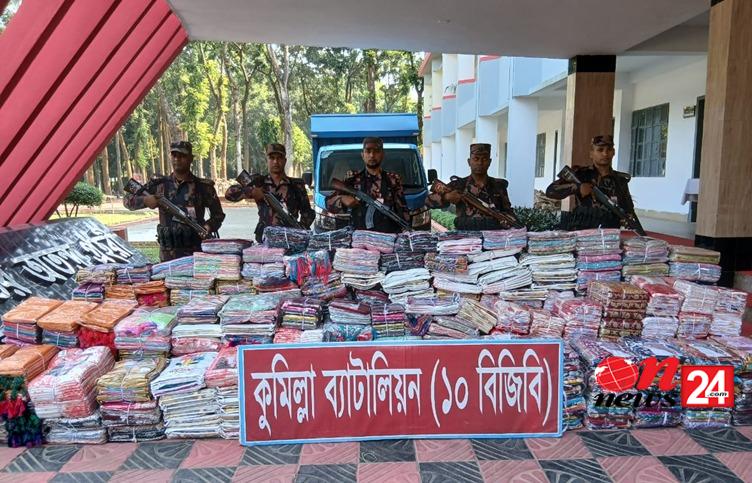 ৩০ নভেম্বর ভোর সাড়ে পাঁচটায় কুমিল্লা আদর্শ সদর উপজেলা ক্যান্টনমেন্ট বাজার এলাকা থেকে অবৈধ ভারতীয় শাড়ি জব্দ করে বিজিবি।