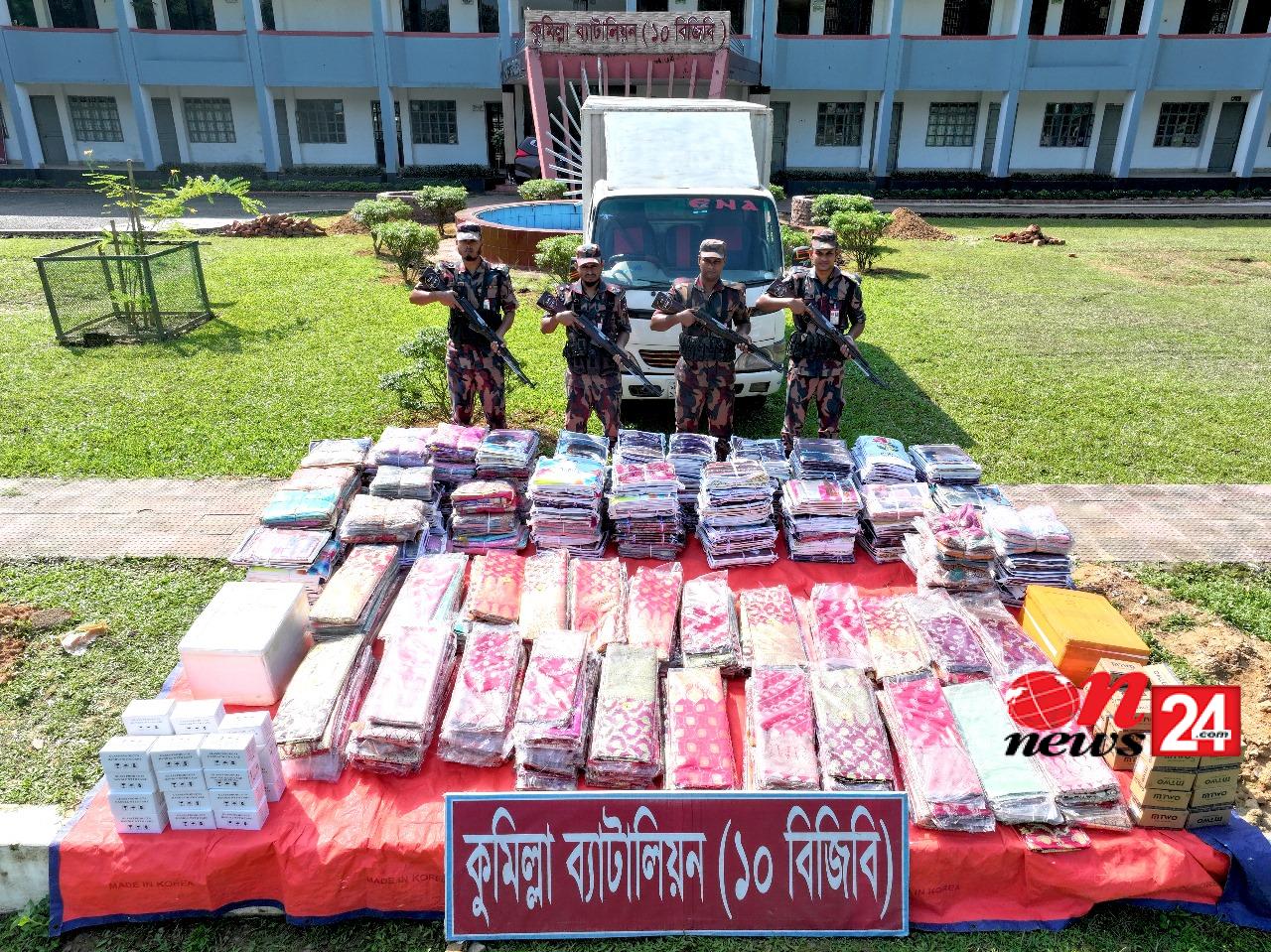 কুমিল্লার সীমান্ত থেকে এক কোটি ৭৪ লাখ টাকা মূল্যের ভারতীয় শাড়ি, মোবাইলের ডিসপ্লেসহ বিপুল পরিমাণ চোরাচালান পণ্য জব্দ করেছে বর্ডার গার্ড বাংলাদেশ (বিজিবি)।