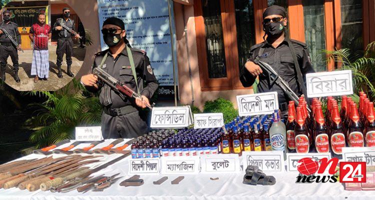 সংবাদ সম্মেলনে র্যাব ১১ এর কোম্পানী কমান্ডার মোহাম্মদ সাকিব হোসেন জানান, পরে আমরা গোপন সংবাদে খবর পেয়ে তার বাড়ীতে অভিযান পরিচালনা করি। এ সময় একটি বিদেশী পিস্তল,২ রাউন্ড গুলি, বিপুল পরিমান দেশীয় অস্ত্র, ৩৩ বোতল বিয়ার, ৪৬ বোতল বিদেশী মদ, ৮৭ বোতল স্কাফ সিরাপ ও ৩০ বোতল ফেন্সিডিল জব্দ করি।