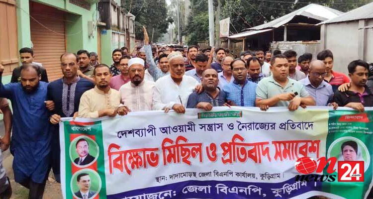 সারাদেশে আওয়ামী সন্ত্রাস ও নৈরাজ্যের প্রতিবাদে কেন্দ্রীয় কর্মসূচির অংশ হিসেবে কুড়িগ্রামে জেলা বিএনপির আয়োজনে বিক্ষোভ ও প্রতিবাদ সমাবেশ অনুষ্ঠিত হয়েছে।
