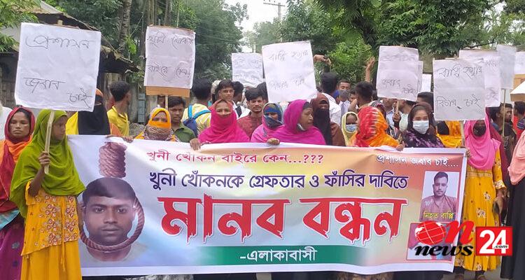 মঙ্গলবার(৭ জুন) দুপুরে সদরের চৌধুরী পাড়া থেকে একটি বিক্ষোভ মিছিল বের হয়ে শহরের জিরো পয়েন্ট (শাপলা চত্বরে) গিয়ে মিছিলটি থেমে সেখানে মানববন্ধন করেন প্রতিবাদকারীরা। এসময় নিহত বাপ্পির আত্মীয়-স্বজন ও প্রতিবেশীরা মানববন্ধনে অংশ নিয়ে দ্রুত প্রশাসনের কাছে অভিযুক্ত খোঁকনের বিচার দাবি করেন।