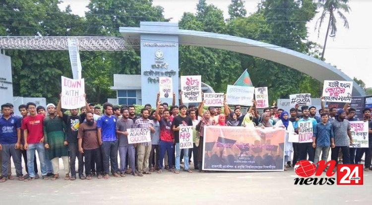 কোটা পদ্ধতি সংস্কারের দাবিতে বিক্ষোভ মিছিল করেছে রাজশাহী প্রকৌশল ও প্রযুক্তি বিশ্ববিদ্যালয়ের (রুয়েট) সাধারণ শিক্ষার্থীরা। প্রথম ও দ্বিতীয় শ্রেণির সরকারি চাকরিতে ৩০ শতাংশ মুক্তিযোদ্ধা কোটাসহ ৫৬ শতাংশ কোটা পুনর্বহালের আদেশের বিরুদ্ধে আন্দোলনে করছেন তারা।