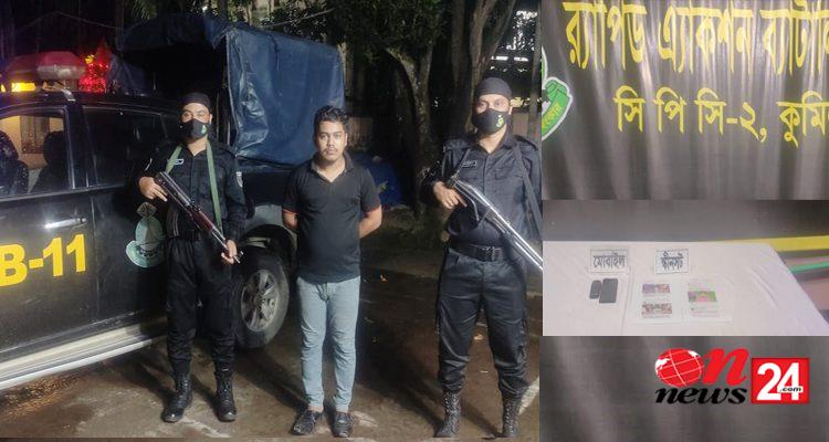 কুমিল্লা নগরীর নানুয়ার দীঘির পাড়ে কোরআন শরীফ অবমাননার অভিযোগ উঠা নিয়ে সামাজিক যোগাযোগ মাধ্যমে গুজব ছড়ানোর দায়ে একজনকে গ্রেফতার করেছে র্যাব। গ্রেপ্তারকৃত ওই যুবকের নাম গোলাম মাওলা (২৬)। সে বুড়িচং উপজেলার কালিকাপুর গ্রামের মৃত তাজুল ইসলামের ছেলে।